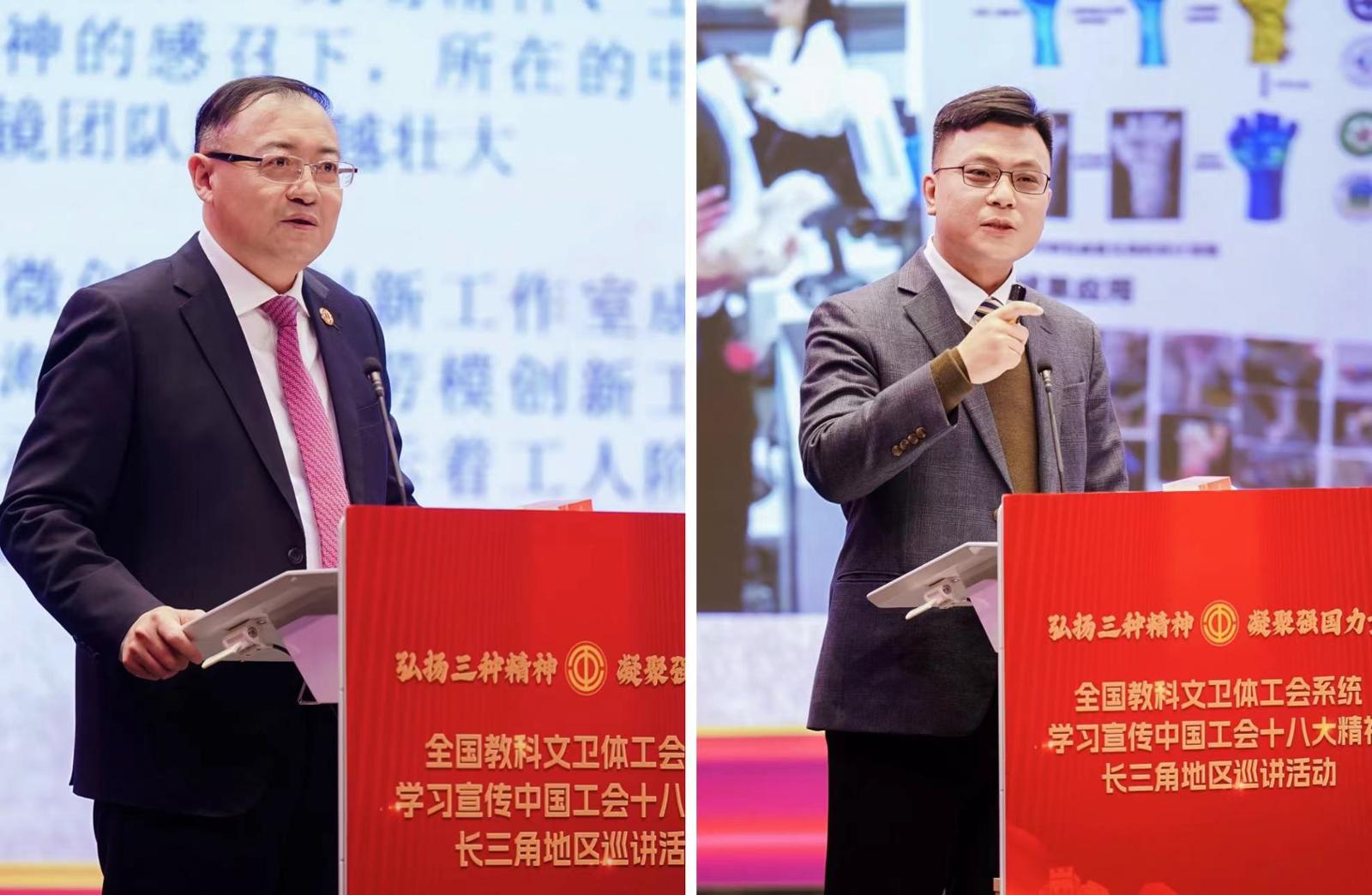 此次宣讲采用“劳模讲、讲劳模”等职工喜闻乐见的方式,生动、鲜活地宣传展示了教科文卫体系统劳模工匠的先进事迹和崇高精神,反响热烈。活动现场,两位中国工会十八大代表——复旦大学附属中山医院内镜中心主任周平红、上海大学机电工程与自动化学院副院长华子恺,分别作了题为《发扬劳模劳动工匠精神,打造世界一流内镜中心》《“为党育人、为国育才”奋进新征程建功新时代》的中国工会十八大精神宣讲报告,分享他们的参会感受与学习体会。