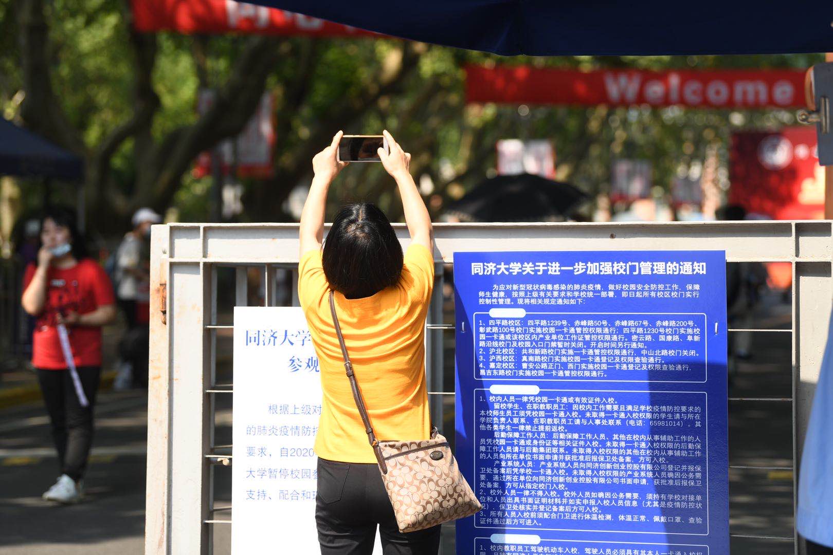 来自四川成都的钟艺虹同学和她的妈妈、大姑、大姑父、二姑、二姑夫一起站在同济大学四平路校区门口拍了一张合影。因为疫情,庞大的亲友团无法入校,有些遗憾地望着家族里最小的妹妹独自一个人拖着行李走进校园。