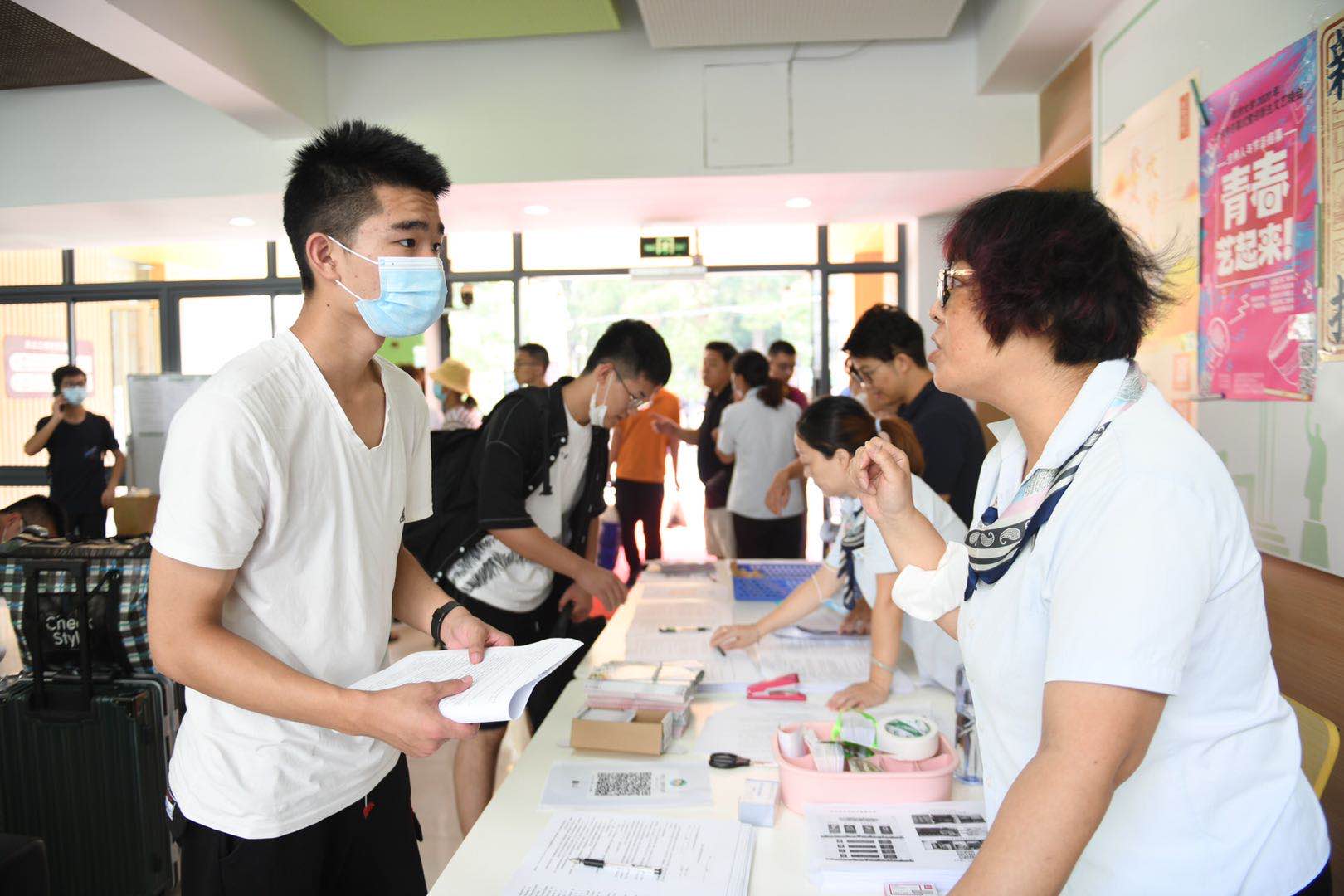 “同学,你哪个专业的?宿舍在什么地方?”一边问,周涛一边熟练地把行李搬到了小推车上。“来,跟我走,我带你去等行李转运车。”周涛是土木工程专业的研二学生,作为新生报到志愿者,这几天他每天7点钟上岗,负责帮新生们托运行李,一趟趟来回运输。在周涛的帮助下,新生郑力维来到了集中乘车点,在这里,新生们将乘坐校园短驳车,带上行李直奔宿舍。