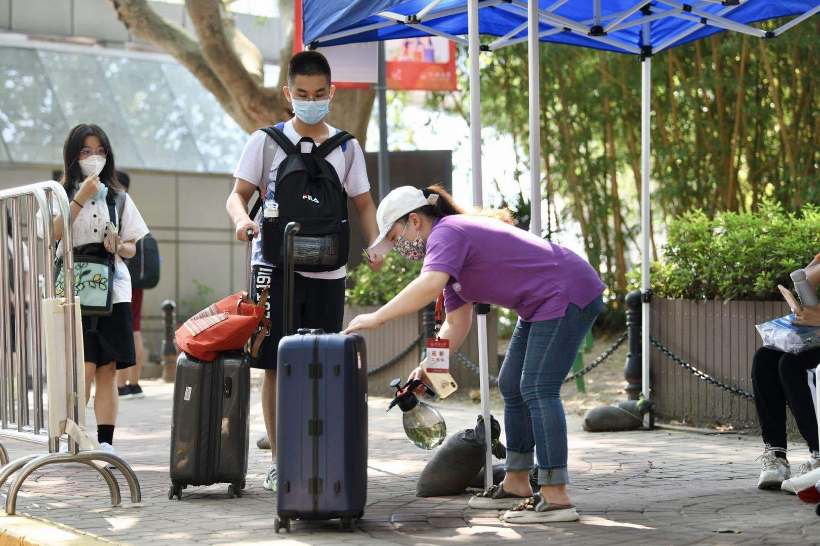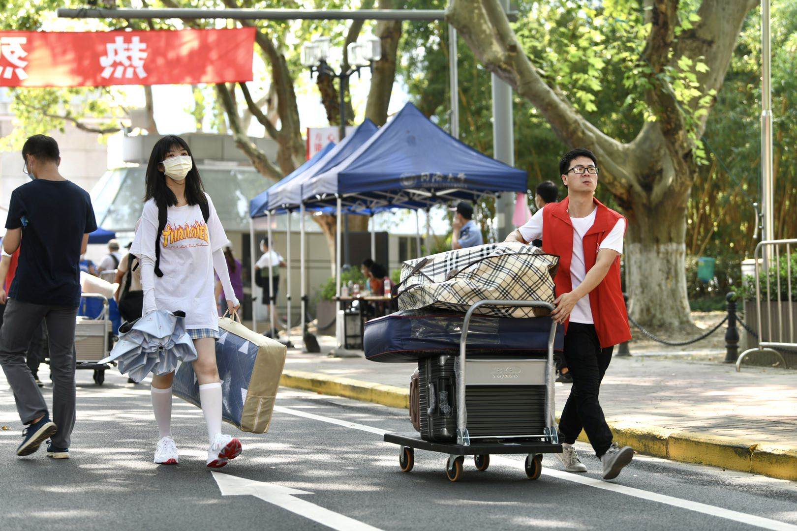两套被子、脸盆、洗漱用品,还有三个行李箱,同济大学工科试验班的新生郑力维戴着口罩,脸上都是汗。他回头朝着护栏外的妈妈招了招手,让她别担心。还没来得及发愁怎么运送这么多行李,穿着红色马甲的志愿者周涛就推着小推车过来了。