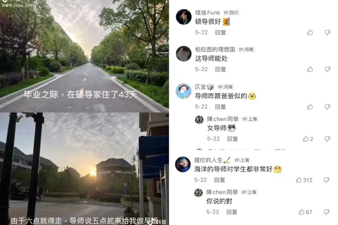 陈金超说,5月22日,他从高老师家离开返乡。6点的车,高老师5点起来给他做早饭。“等我吃完,笑盈盈的送我出门,就像老母亲一样。到了虹桥,我在抖音上发了条短视频,很快有5000多的点赞,大家都羡慕我有这样一位好导师!”