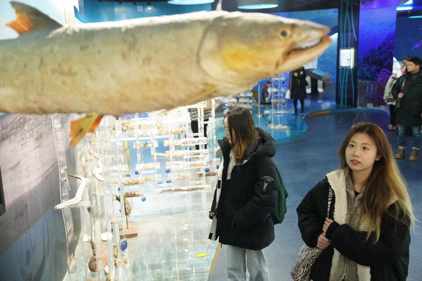 张晓雯是该校水产与生命学院2021级海洋生物专业的学生。上完钟老师的课以后,她又来到了鱼类标本馆。“钟老师要求我们在上课前先到这里来‘预习’一下,课后还来‘复习一下’,才能感受到鱼类分类的魅力所在。”但由于之前都是线上上课,无法返校,因此,这门功课的“实地观摩”到今天才得以完成。