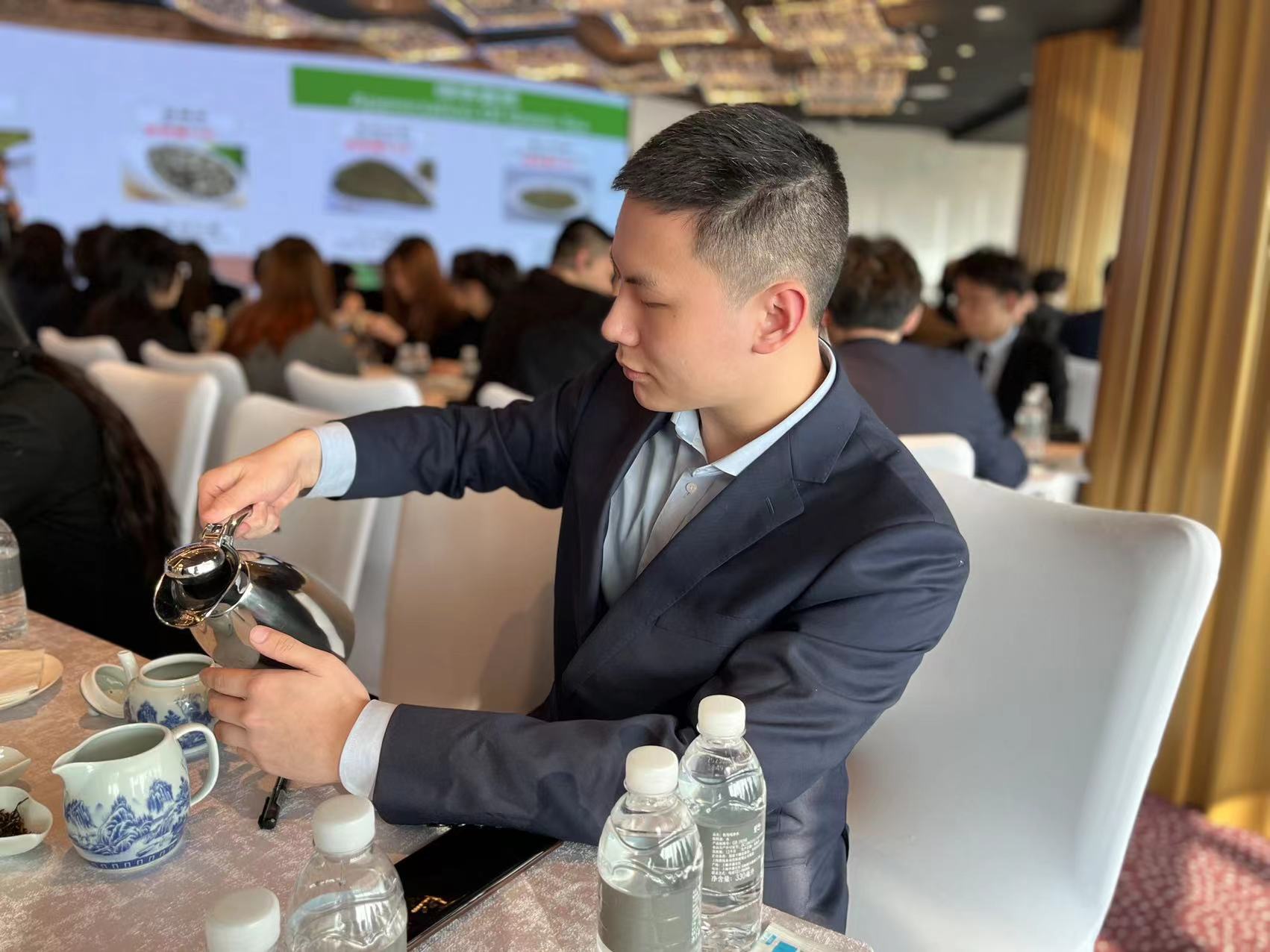 “学习茶艺,首先要了解和掌握茶叶的分类……”4月26日下午,在坐落于云端的上海J酒店的盛庭宴会会议厅里,一堂特别的茶艺课正在进行。坐在台下的是上海洛桑酒店管理学院2021级本科生,他们各个身着正装,跟着老师一起学习茶艺知识、鉴赏红酒、品尝咖啡。