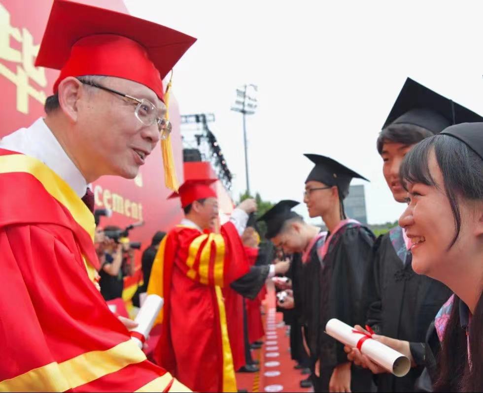 在拨穗环节,近千名2022届毕业生和各学院2023届本科、硕士、博士毕业生身着各式学位服,一批批先后上台。校领导、院士和院长们依次为一位位毕业生发放写满深情寄语的纪念卷轴,并为同学们一一拨穗。一批摄影师在侧,随着快门一次次按下,每一位毕业学子接受“一对一”拨穗的历史性画面被永久定格。