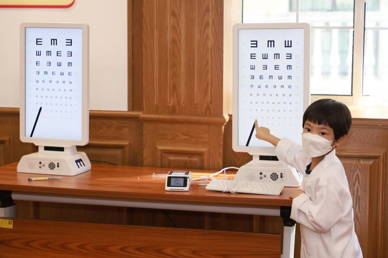 “小小医生”体验裸眼视力检查工作。主办方 供图