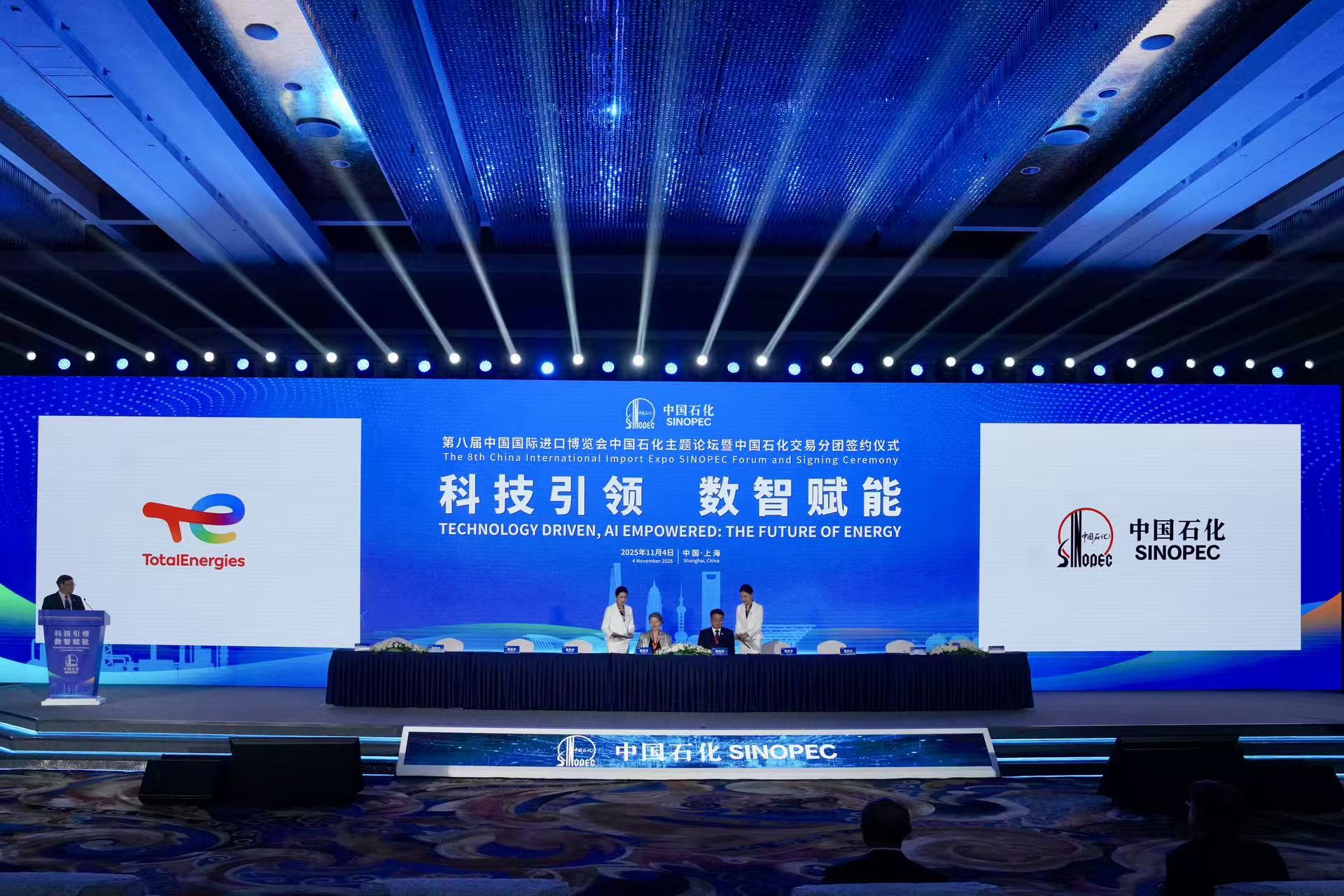 11月4日,第八届中国国际进口博览会中国石化主题论坛暨中国石化交易分团签约仪式在沪举办。论坛以“科技引领 数智赋能”为主题,聚焦数智赋能、推动技术创新和新材料研发、增强供应链韧性,探讨深化国际能源合作。签约仪式上,中国石化与来自17个国家、地区的34家合作伙伴签约,涉及原油、化工品、设备、材料、消费品等10大类24种产品,采购签约金额超409亿美元。自2018年首届进博会以来,八届进博会上中国石化累计签约超3250亿美元。