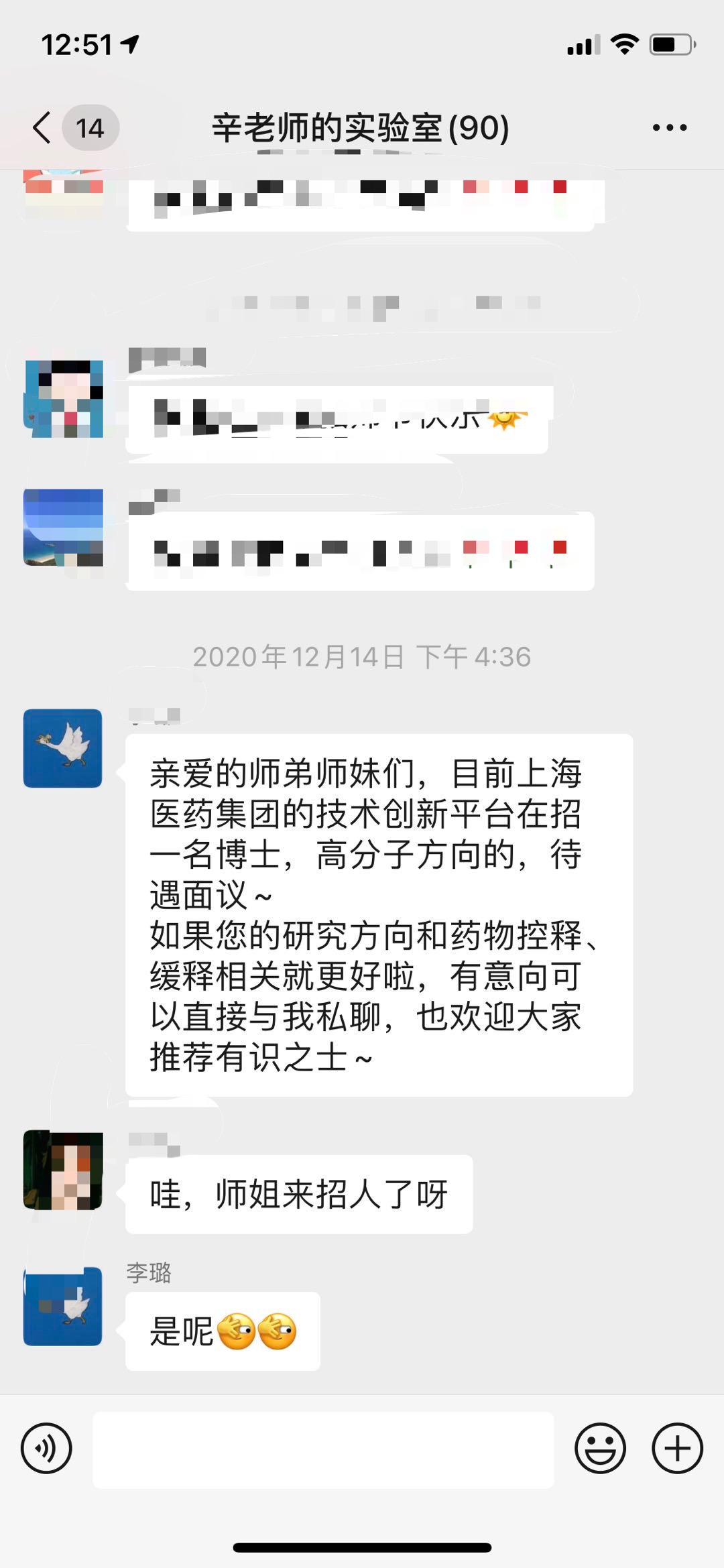 “师兄师姐们也帮助了我们很多。”秦炜说,比如我们课题组的于昌永非常憧憬万华化学,童闯闯师兄刚好就职如此,就远程视频指导,传授笔试面试以及工作经验;潘燕玲求职遇到瓶颈,中电二十三的罗吉师兄主动内推,助力师妹顺利拿下offer;范敏对医药行业感兴趣,上海医药集团的李璐师姐主动分析行业动态和发展前景。