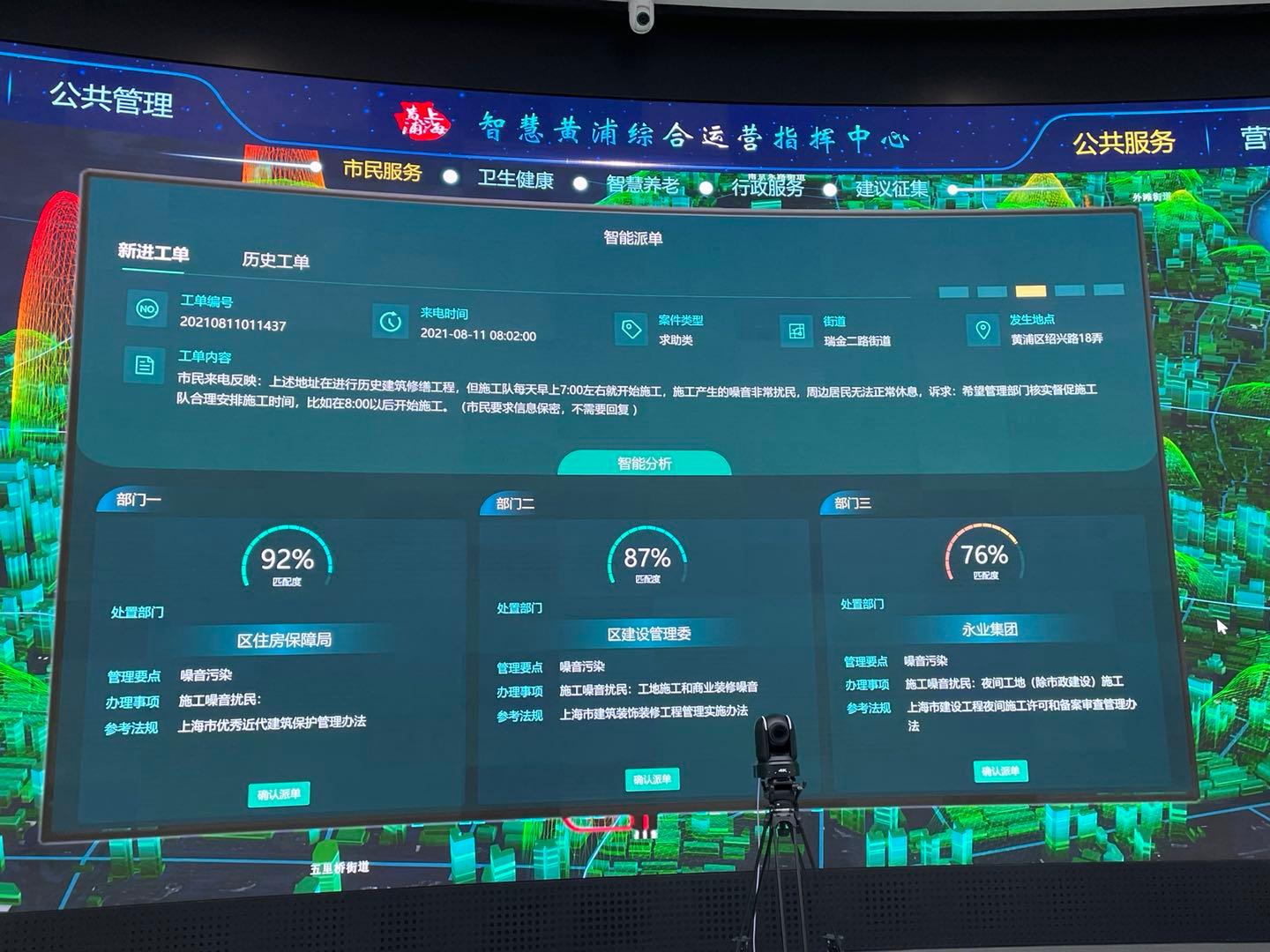 记者在“智慧黄浦”综合运营指挥中心内看到,一颗“智慧大脑”通过大数据分析、NLP技术(自然语言处理)技术,将各类噪声扰民的热线工单智能分配给相关委办局。