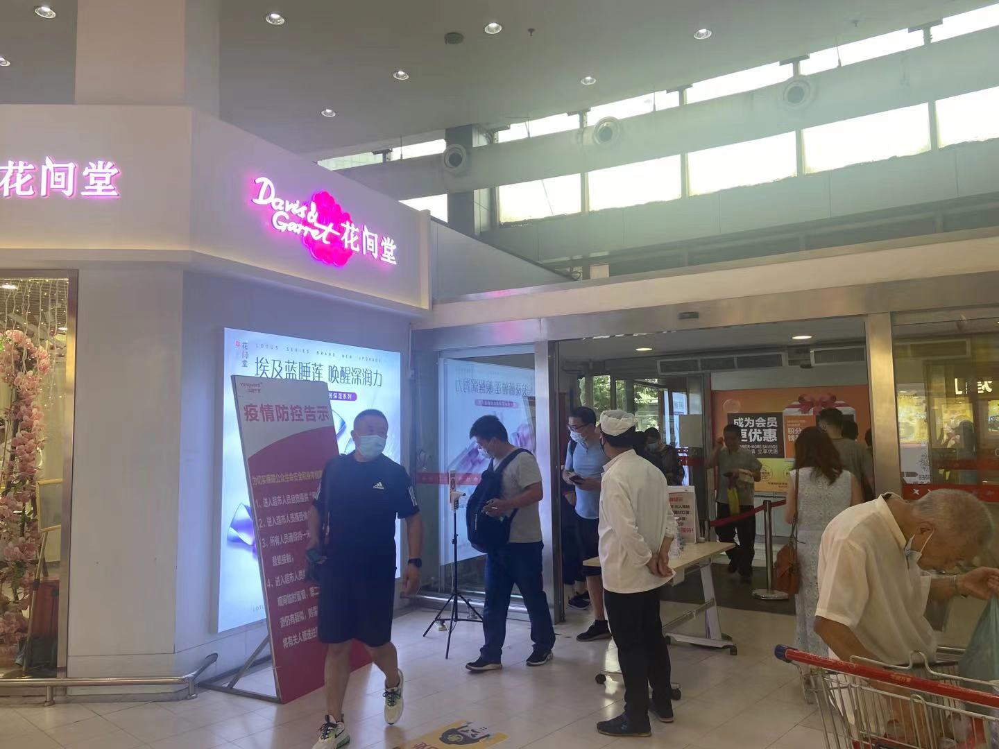 记者看到,超市门口不仅有三名工作人员检查出入顾客的健康码,里面还有一名专人看管洗手液与口罩,防疫措施非常到位。