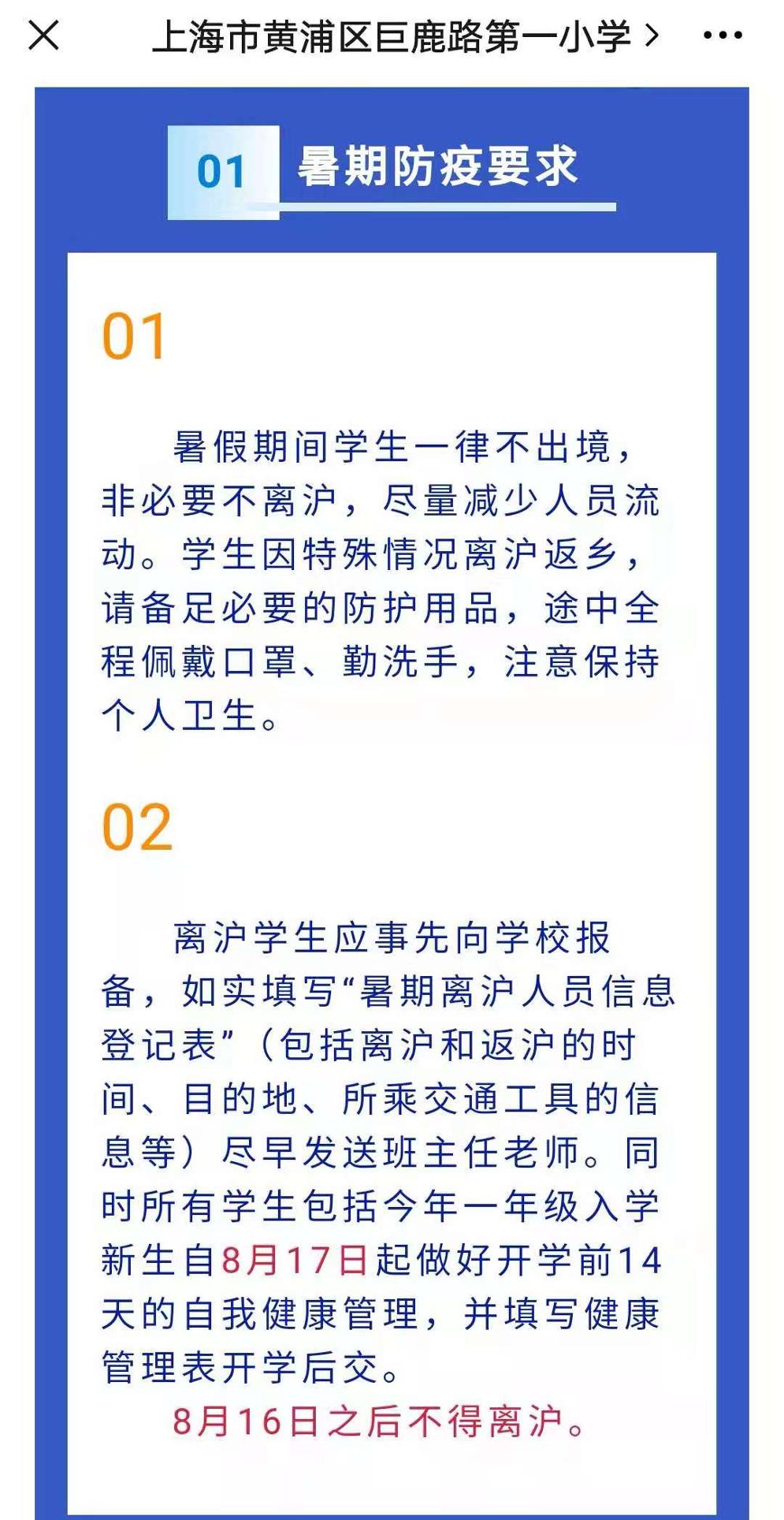 比如,上海市黄浦区巨鹿路第一小学就明确提出:今年一年级入学新生自8月17日起做好开学前14天的自我健康管理,并填写健康管理表开学后交。8月16日之后不得离沪!离沪学生应事先向学校报备,如实填写“暑期离沪人员信息登记表”(包括离沪和返沪的时间、目的地、所乘交通工具的信息等)。