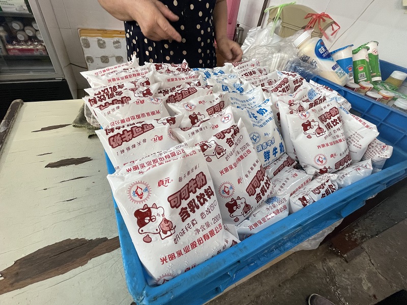 “现在来逛小菜场的人少了,像你这样的小年轻不多见。来我这里买牛奶的都是老邻居,一次就买五六包。还有三十多岁的,从青浦、松江赶过来,一口气买三四十包。”刘阿姨告诉记者,以前每天可以卖两三百包可可牛奶,最近几年买的人明显变少了。“主要是格只牛奶口味偏甜,现在的人更加欢喜买淡的纯牛奶。”为了顺应时代潮流,刘阿姨的牛奶屋现在也开始搭售整箱的牛奶以及果汁饮料。