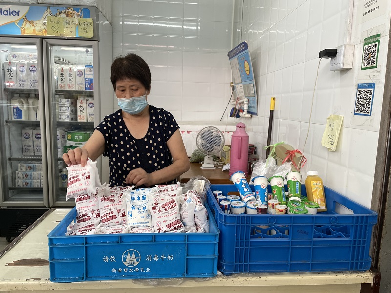 听到手机里传来的收账声,刘训英麻利地拿起一包巴掌大小的袋装牛奶,手上的小剪刀翻飞,剪下一个小口,再夹起一根吸管,稳稳插进袋中。