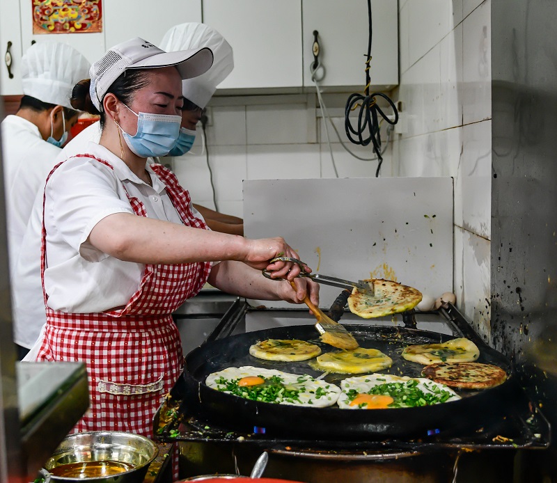 “伯伯,我给您拿个凳子,先坐坐,下一锅马上就好。”这位爷叔想买的咸味酥饼还没出锅,老板娘赶紧拿出塑料凳,扶老人坐下。“顾客里老人多,我们准备好了板凳,专门给叔叔阿姨坐坐。”这是老板娘的生意经。