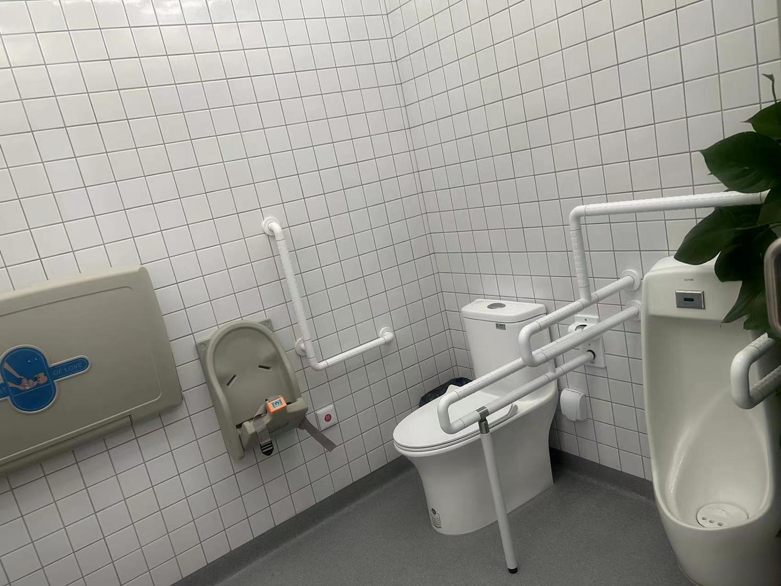 原先进入公厕的坡道旁早已经安装过扶手,考虑到扶手的直角转弯对老人和小孩可能存在安全隐患,这次全部改为了圆角。4个第三卫生间内,均配备适合孩子使用的高低洗手盆、儿童坐便器、折叠式儿童安全座椅,台盆和坐便器边都装上了扶手及紧急按钮。男厕所的小便池,有的也改为了低位小便池。