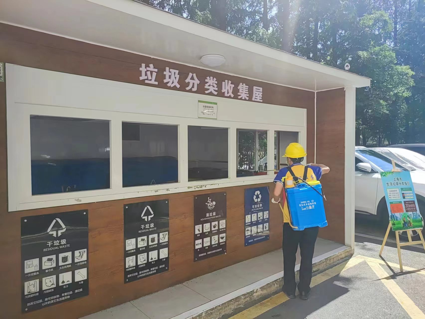 “喷洒药物时会产生异味,低楼层住户在喷洒药物期间请关好门窗。消杀期间及消杀后一段时间内,请照顾好儿童、宠物,不要进入绿地玩耍,避免随意触摸绿化,一旦触摸绿植请及时洗手。”工作日上午9点许,当笔者走进位于普陀区的中远两湾城住宅小区,只见每一栋居民楼前和告示栏内,均张贴着这份《7月绿化消杀通知》。在小区东二门的垃圾厢房区域,身着蓝黄色工作服的操作人员已投入作业,对墙面、垃圾厢房进行滞留喷洒作业。绵密的药雾让蚊虫无处遁形。