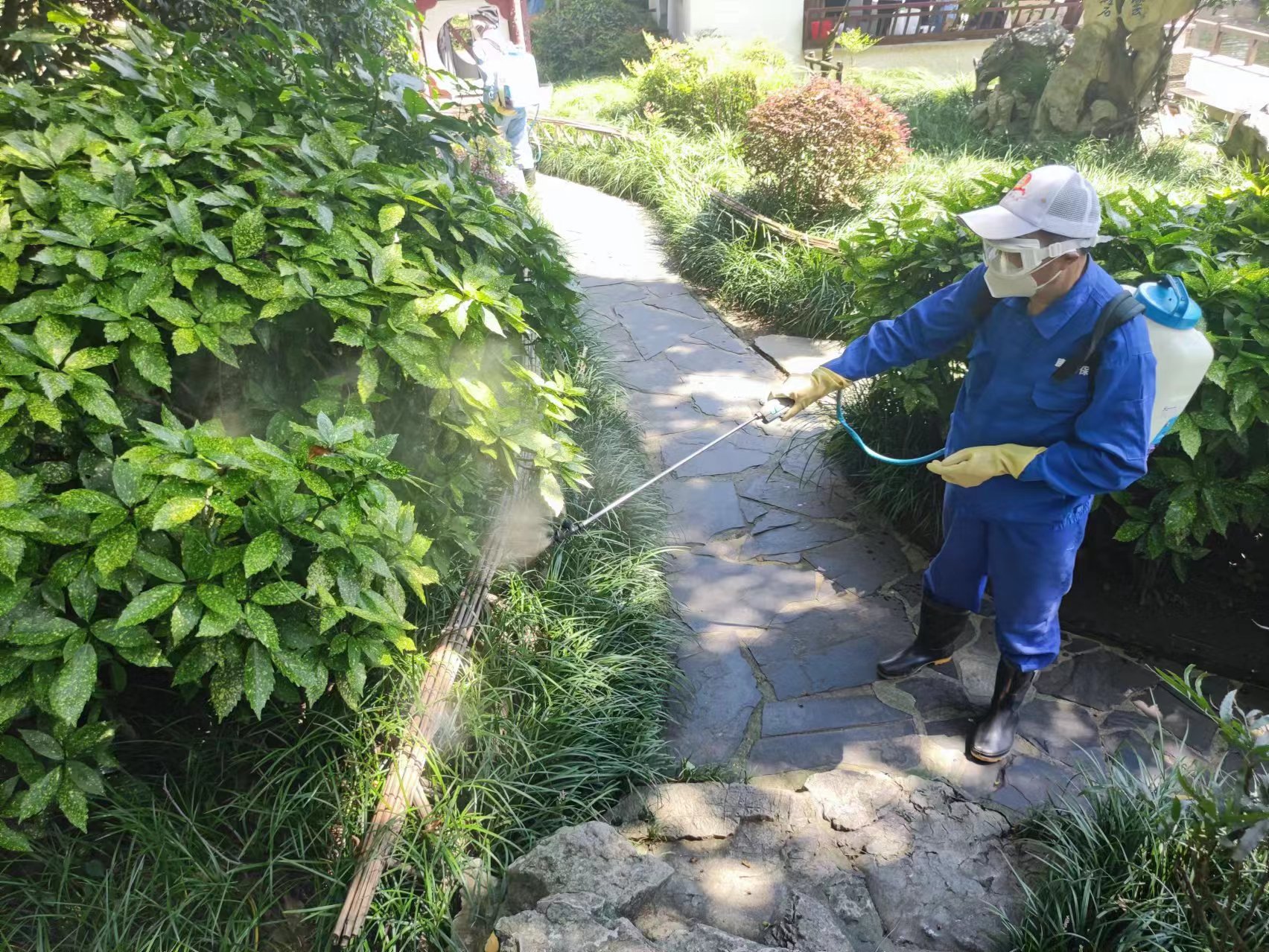 在现场,笔者在防制队老师傅的指导下,戴上了手套、口罩、护目镜,全副武装后背上30斤重的喷雾机,开始跟着师傅穿梭于茂密的园林树丛中,喷洒药水。
