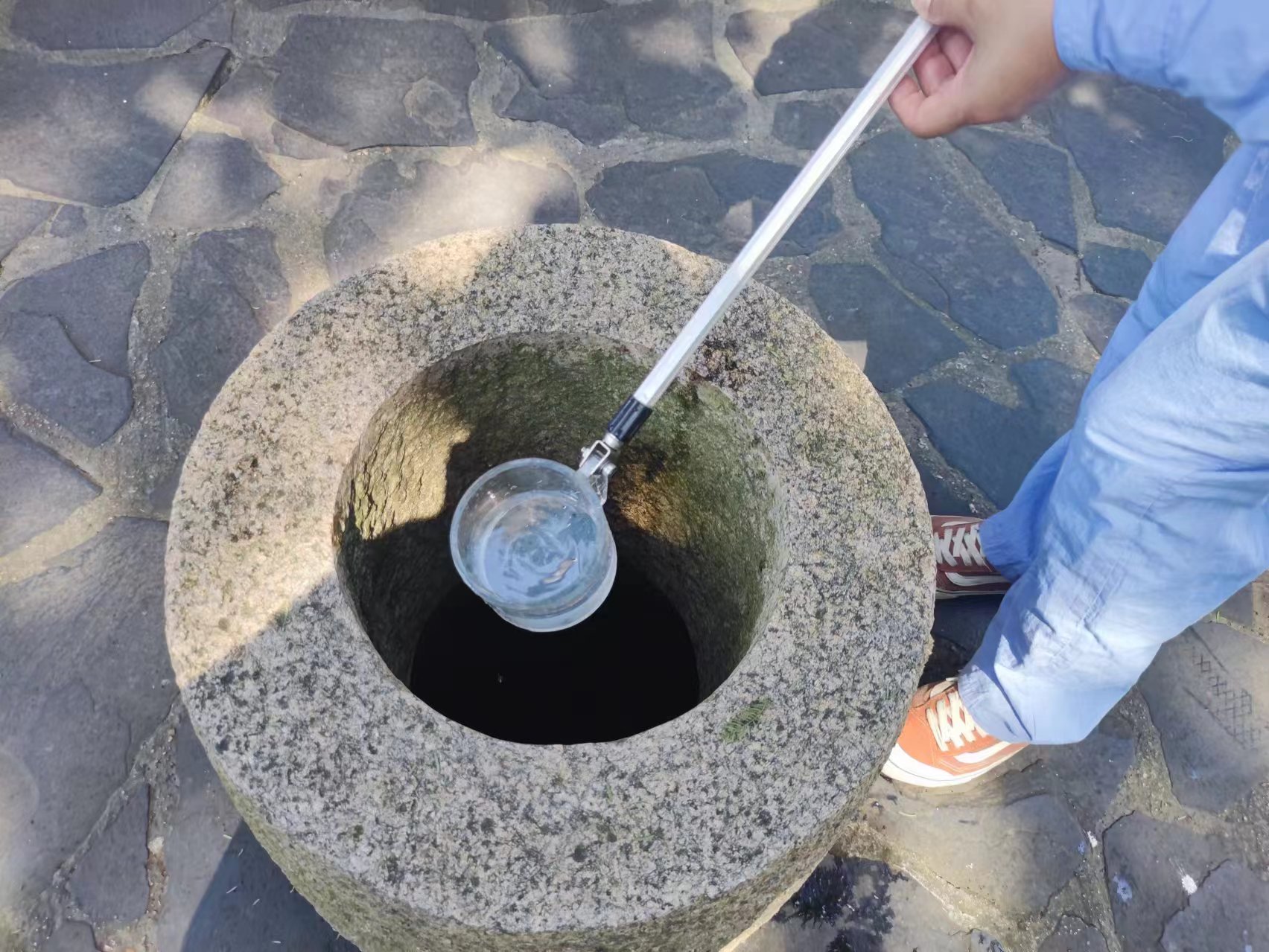 打捞古井检测水质里是否有孑孓存活。吴泽顺 摄影