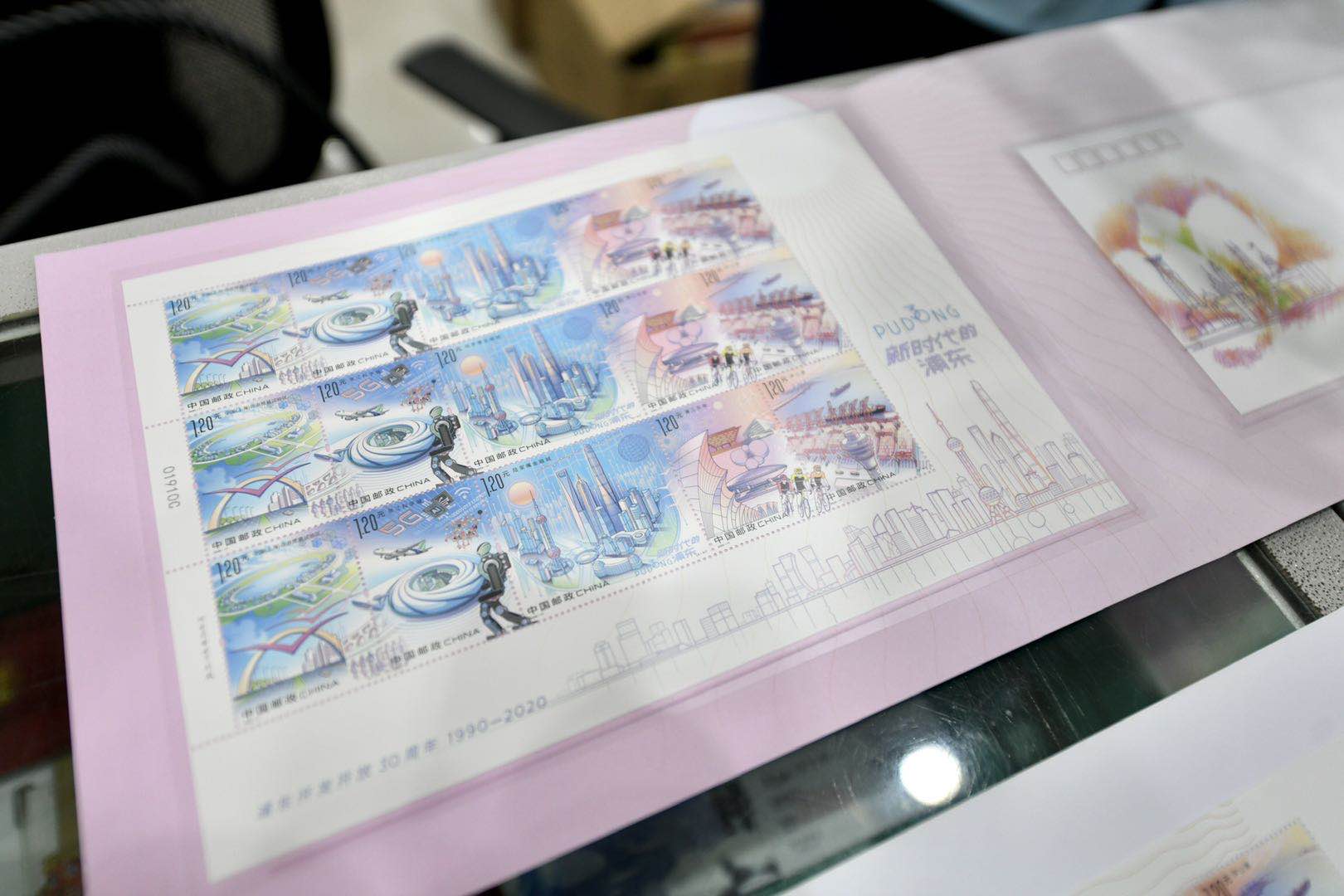 上午8点,伴随着网点开门,邮票正式开售。邮票、首日封、珍藏册……各类邮品都受到了追捧。不少邮迷们拿到新鲜出炉的邮票,第一时间盖上今天的邮戳后寄递。陈先生是第一位买到邮票的邮迷,他兴奋地展示了手里的大版邮票。他说,自己早就得知了这套邮票要发行的消息,作为一个在浦东生活了几十年的集邮爱好者,这套邮票是一定不能错过的。“和普通的邮票不一样,这次的邮票是5枚连票,将浦东开发开放30年的主题展现得淋漓尽致。”