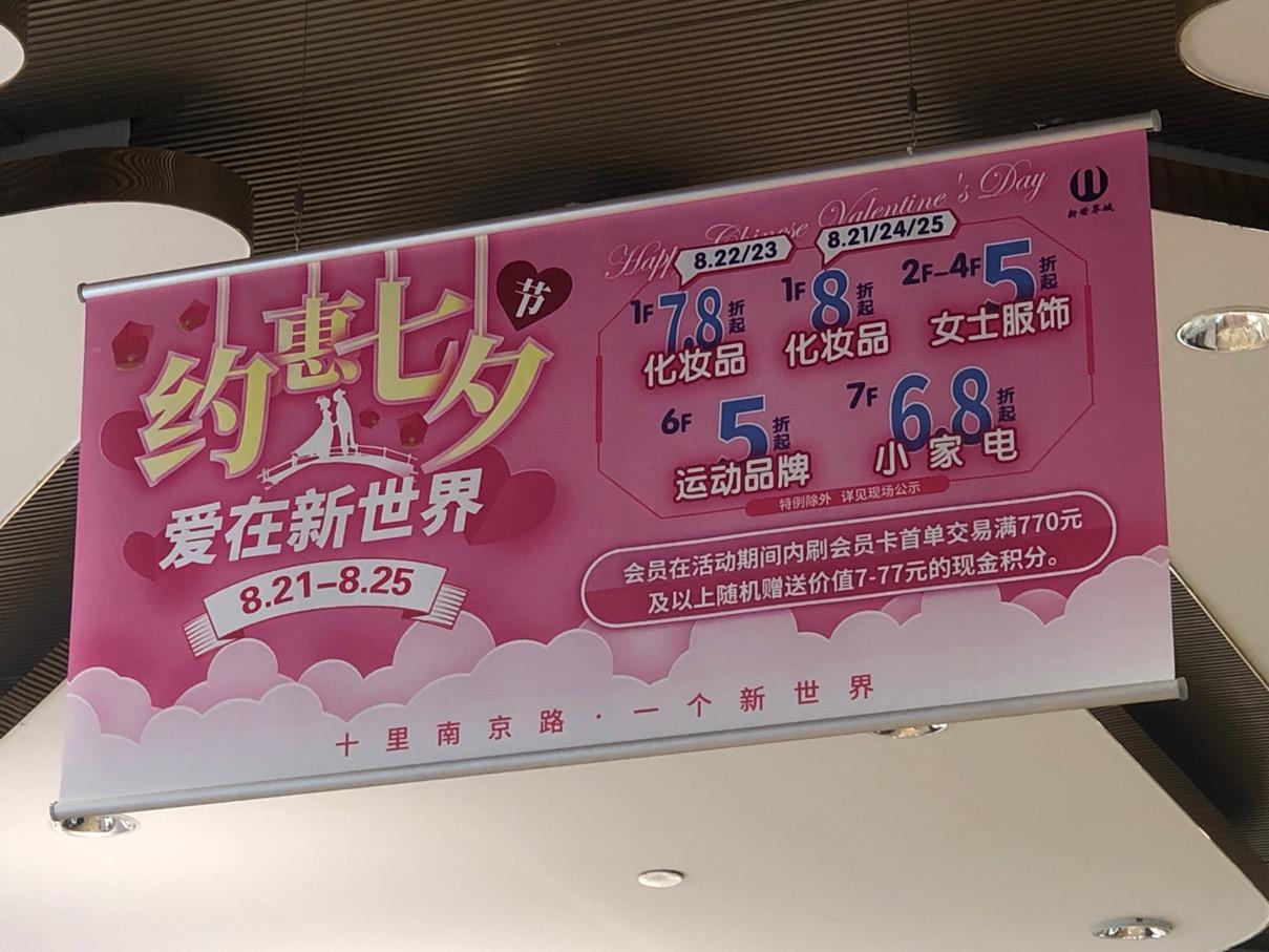 “秋装现在是9折,夏装是7折。目前秋装已基本出货,下个月就要换上冬装了。而现在的七夕活动,除了相关折扣外,购买满2800元还会赠送品牌袜子。”新世界城Dazzle品牌专柜工作人员告诉记者,趁着七夕,女装专柜开启折扣促销,周一工作日的客流量也不少。而在Scofield女装专柜,工作人员告诉劳动报记者,大部分女装是7折,夏装有一部分是5折,也是七夕节的限时折扣。