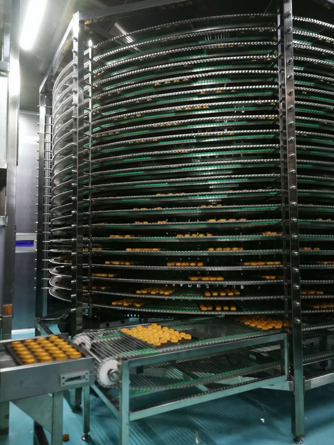 除了途径38米长的“隧道炉”烘烤外,还有一座4.5米高的“冷却塔”。能让一只只新鲜烘焙出炉的月饼,在35分钟内降温至35℃的常温,完成冷却。沈全华笑称沿着巨型“冷却塔”从下往上看月饼,常抬头可以“治颈椎”。