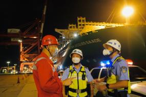 鉴于全船船员近14天均未离沪,涉疫风险较低,洋山边检站与船厂所在地崇明边检站密切配合,由崇明边检站为船舶办理新船船体检查手续和船员人证对照手续,船舶靠泊洋山港后洋山边检站为船员加盖出境验讫章,通过“接力办”保证船舶从换旗交付到首航出境边检手续的无缝衔接。船舶靠港后,洋山边检站组织警力加强码头巡查力度和口岸限定区域管理,保障船舶首航仪式和装船作业安全,并于作业完毕后通过“网上办”为船舶办理出境边检手续,减少人员接触,保障船舶及时启航离境。