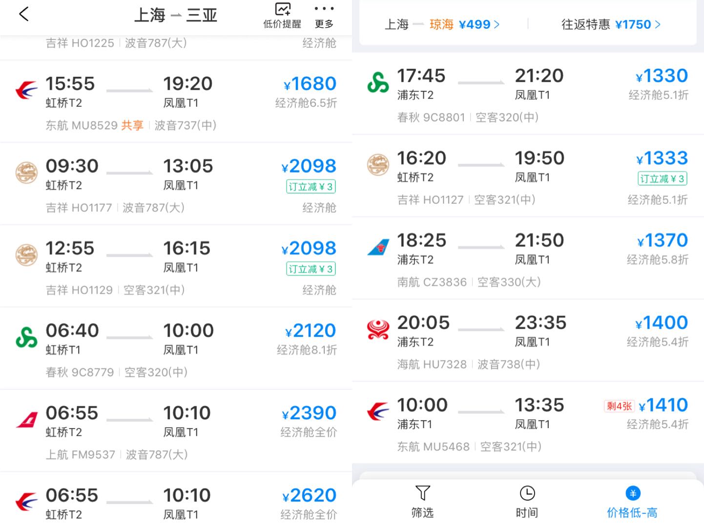 11月30日,记者在多个旅游购票APP上查询后发现,目前,元旦期间,上海—三亚的单程机票已经有了全价票的出售,例如东航的一趟航班,经济舱全价为2620元,但也有不少航空公司给出了对折票的优惠力度,价格基本在1300元左右。