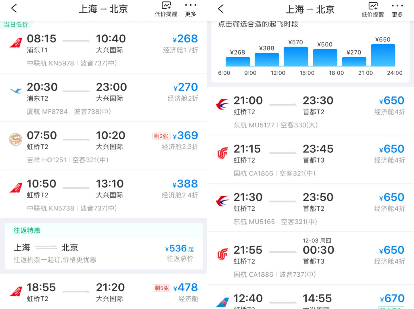 11月30日,记者查询了多个购票APP平台后发现,此前京沪航线全价票飘红的情况并未出现,各大航空公司都挂出了较大折扣的低价票。其中,最低的价格仅为经济舱的2折,售价仅270元。