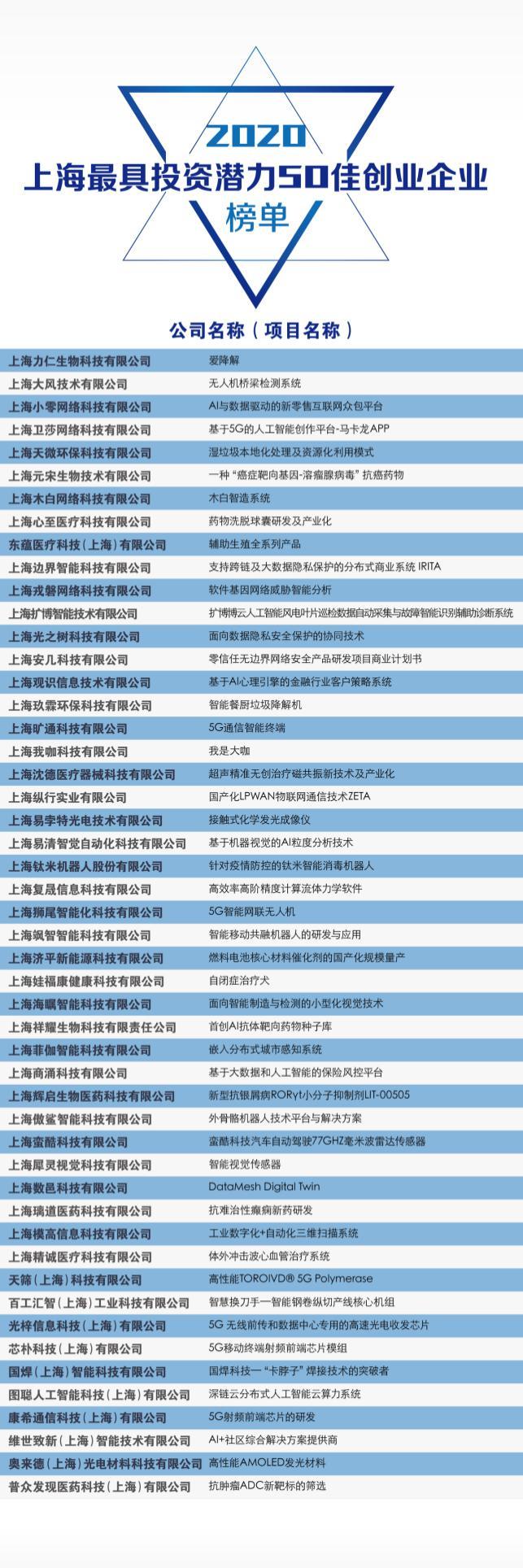 百余家上海企业入围了评选,最终评选产生了“2020年上海最具投资潜力50佳创业企业”榜单。