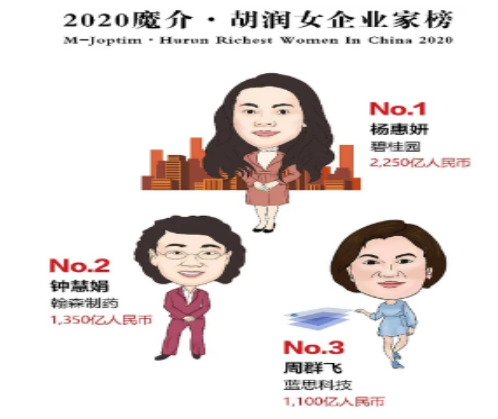 榜单显示,碧桂园39岁的杨惠妍财富增长500亿,以2250亿连续四年蝉联中国女首富。手机玻璃屏生产商蓝思科技50岁的周群飞以1100亿进入前三,成为湖南女首富。蚂蚁集团49岁的彭蕾是白手起家上榜新人中排名最靠前的,以305亿位列第19名。