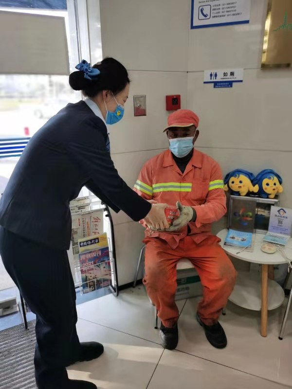 经过一晚的风雪交加,申城迎来了零下低温的寒冷气候。一大早,一名环卫师傅踟蹰地走进了位于曹路的建行。大堂经理看到后,赶紧把他请进了网点的“劳动者港湾”,环卫师傅不太好意思地说道,“外面风太大了,我就想进来站一会儿,暖和下。”在得知师傅还没吃早饭时,大堂经理为他送上了一碗热腾腾的泡面。“这怎么好意思,不用了不用了,能坐会儿已经很好了。”