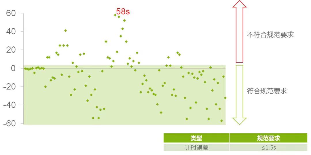在本次比较试验中,110次测试的计时误差范围在-57s至58s之间。规范要求计时误差≤1.5s,本次比较试验有35次计时误差不符合规范要求。