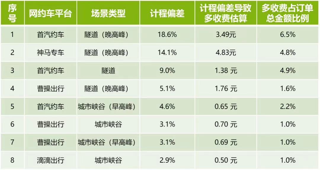 比较试验依据《网络预约出租汽车计程计时技术要求(试行)》,模拟消费者在网约车平台下单,每个平台进行11次测试,覆盖高峰期(7:30-9:30,16:30-19:00)和非高峰期(10:00-16:00)两种时间段,包括机场线、城市峡谷、林荫路、高架上、高架下、隧道等6种典型场景,将每次测试订单中平台用于结算的里程和时长,与标准检测设备测试出来的里程和时长进行对比,以反映计程、计时误差。
