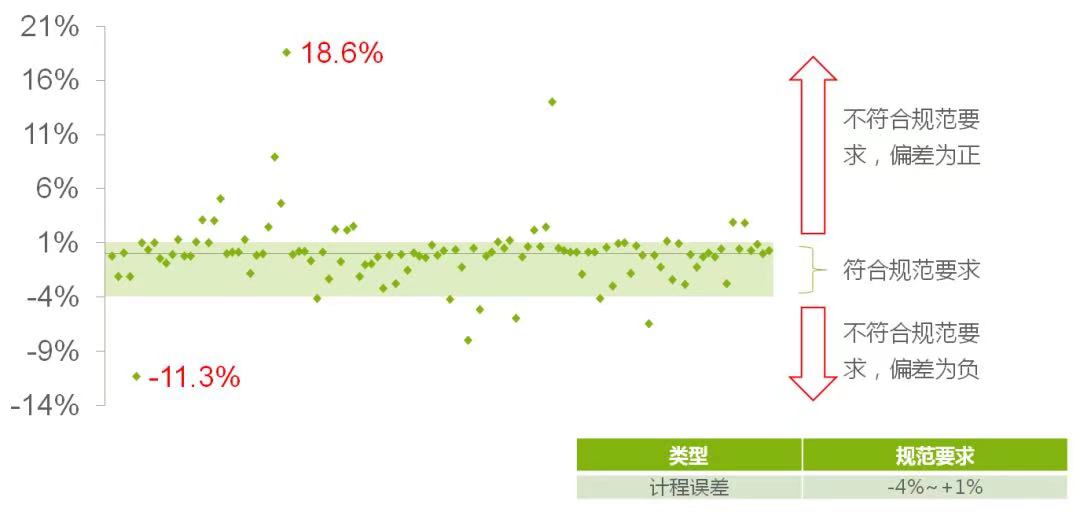 在本次比较试验中,110次测试的计程误差范围在-11.3%至18.6%之间,在城市峡谷和隧道等场景中容易出现较大偏差。规范要求计程误差-4%~+1%,本次比较试验有30次计程误差不符合规范要求,其中22次误差>1%。