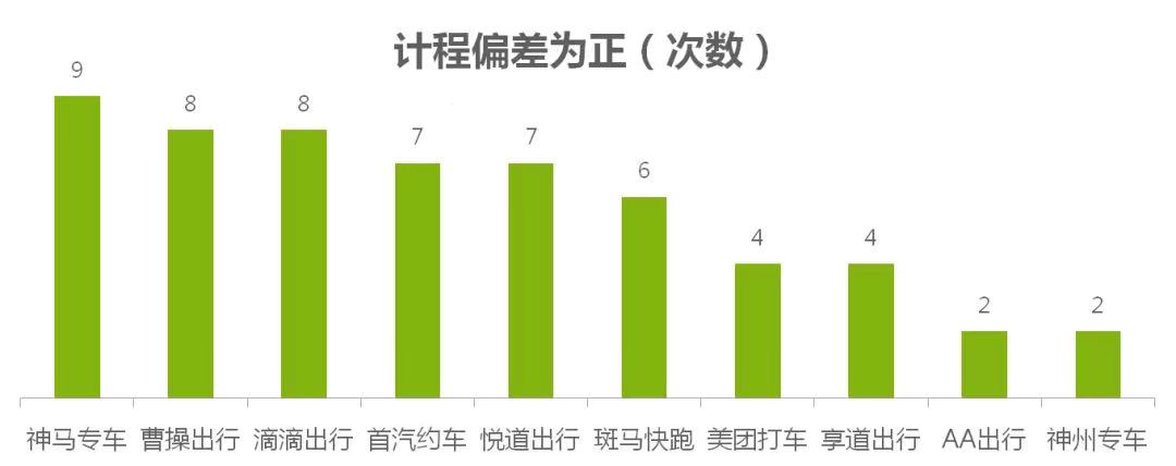 110次测试中,计时正偏差有40次,会导致消费者被多收费。除享道出行用于结算的时长精确到0.01min外,其余9家网约车平台用于费用结算的时长单位均为1分钟(或四舍五入、或舍掉秒数),故因计时带来的最大费用偏差为服务车型的每分钟计费单价。