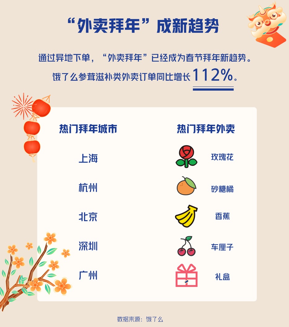 “亲爱的妈妈,新年快乐,情人节快乐”,恰逢情人节,不少游子也选择用鲜花外卖给父母拜年。整体来看,鲜花、砂糖橘、车厘子等水果、成箱的牛奶等成为“外卖拜年”热门年货。同时,过年期间,饿了么参茸滋补类外卖订单同比增长112%。
