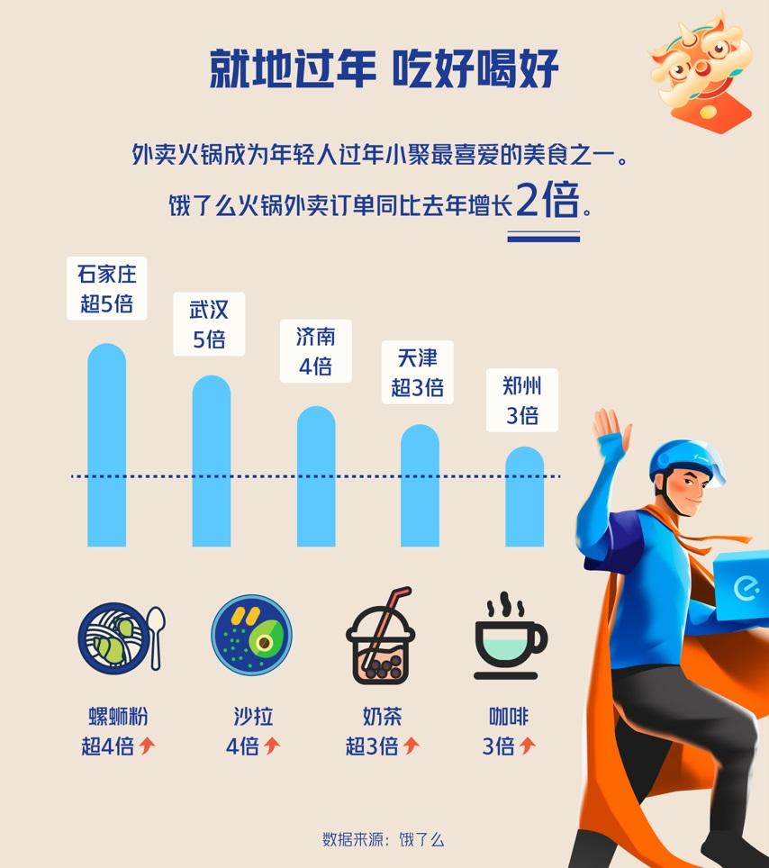 就地过年,如何热气腾腾闹新春?饿了么数据显示,牛年新年以来,火锅、奶茶等外卖订单增幅均在2倍及以上。同时,越来越多留在工作地过年的年轻人开始尝试“外卖拜年”,换个定位远程给老家的长辈朋友下单送祝福,参茸滋补礼盒、鲜花和水果等成为热门拜年礼。