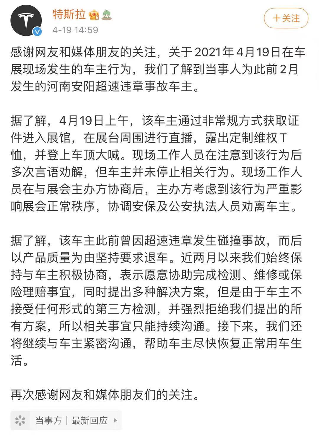 今天下午特斯拉发布微博回应称,该车主通过非常规方式获取证件进入展馆,在展台周围进行直播,露出定制维权T恤,登上车顶大喊。我们在注意到该行为后多次言语劝解,但车主并未停止非理性行为。在与展会主办方协商后,考虑到该行为严重影响公共秩序,主办方协调公安执法人员劝离车主。