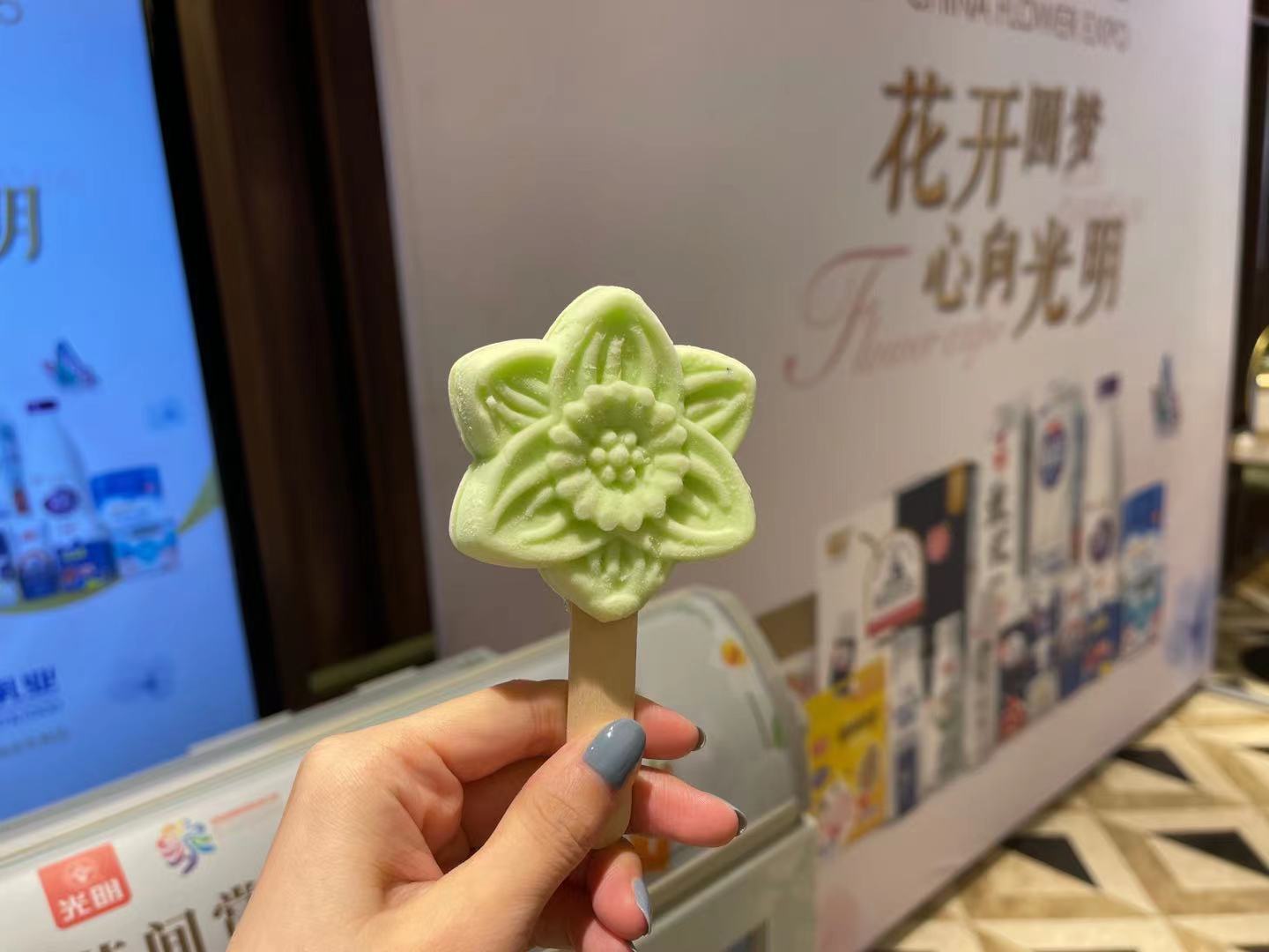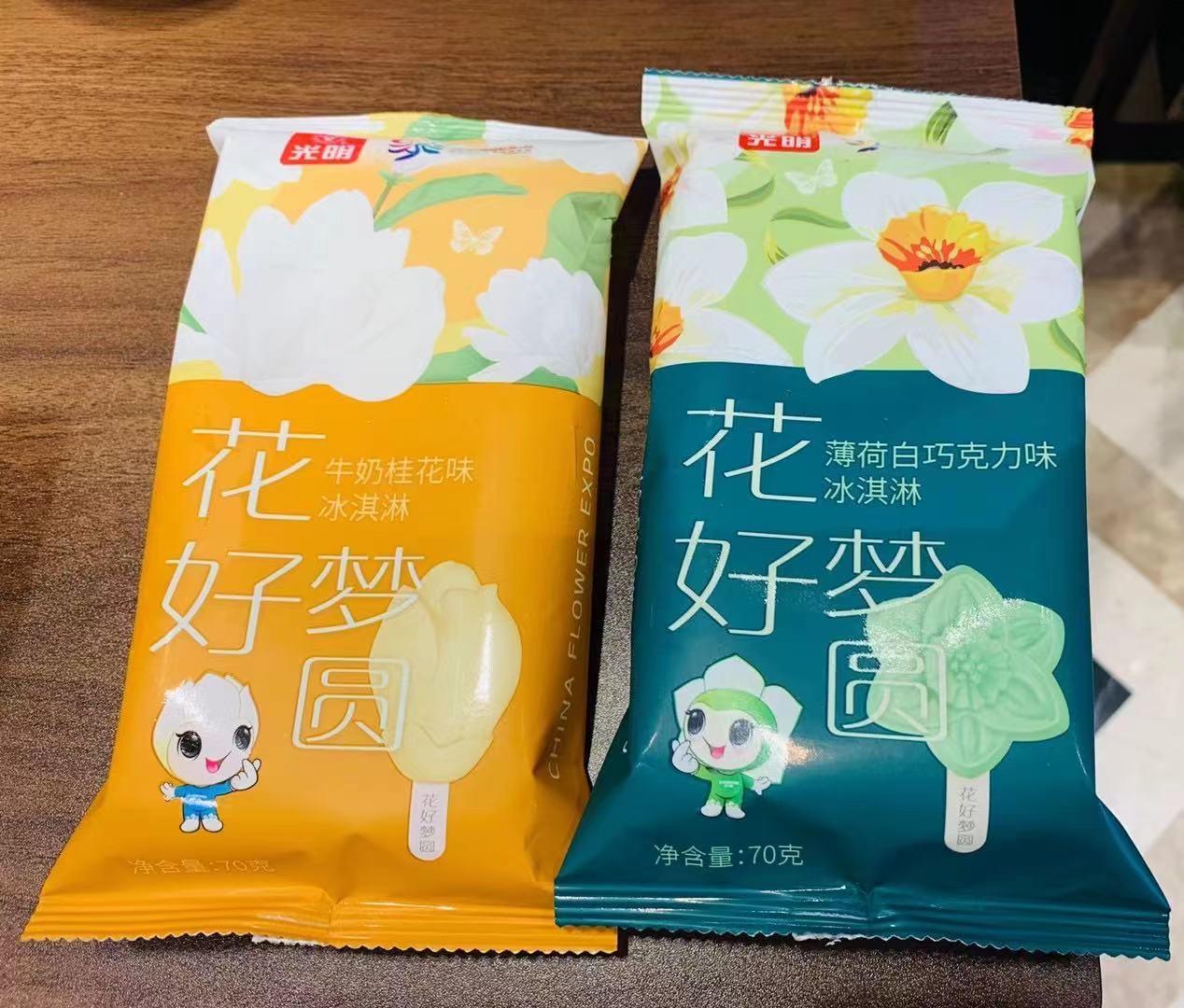 既是花博会新品季,更少不了以本届花博会吉祥物“圆圆”“梦梦”为代表的定制款产品——光明花好梦圆冰淇淋。这是光明冷饮历史上首次创新推出的立体异形冰淇淋。其中,牛奶桂花味采用了“圆圆”代表的上海市花白玉兰花为造型,原料选用进口奶粉融入糖桂花,令花香奶香充盈齿间,余味悠长;薄荷白巧克力味采用了“梦梦”代表的崇明水仙花为造型,在进口奶粉中同时加入薄荷叶、进口白巧克力食材,宛若层叠的花瓣,口口皆有惊喜。