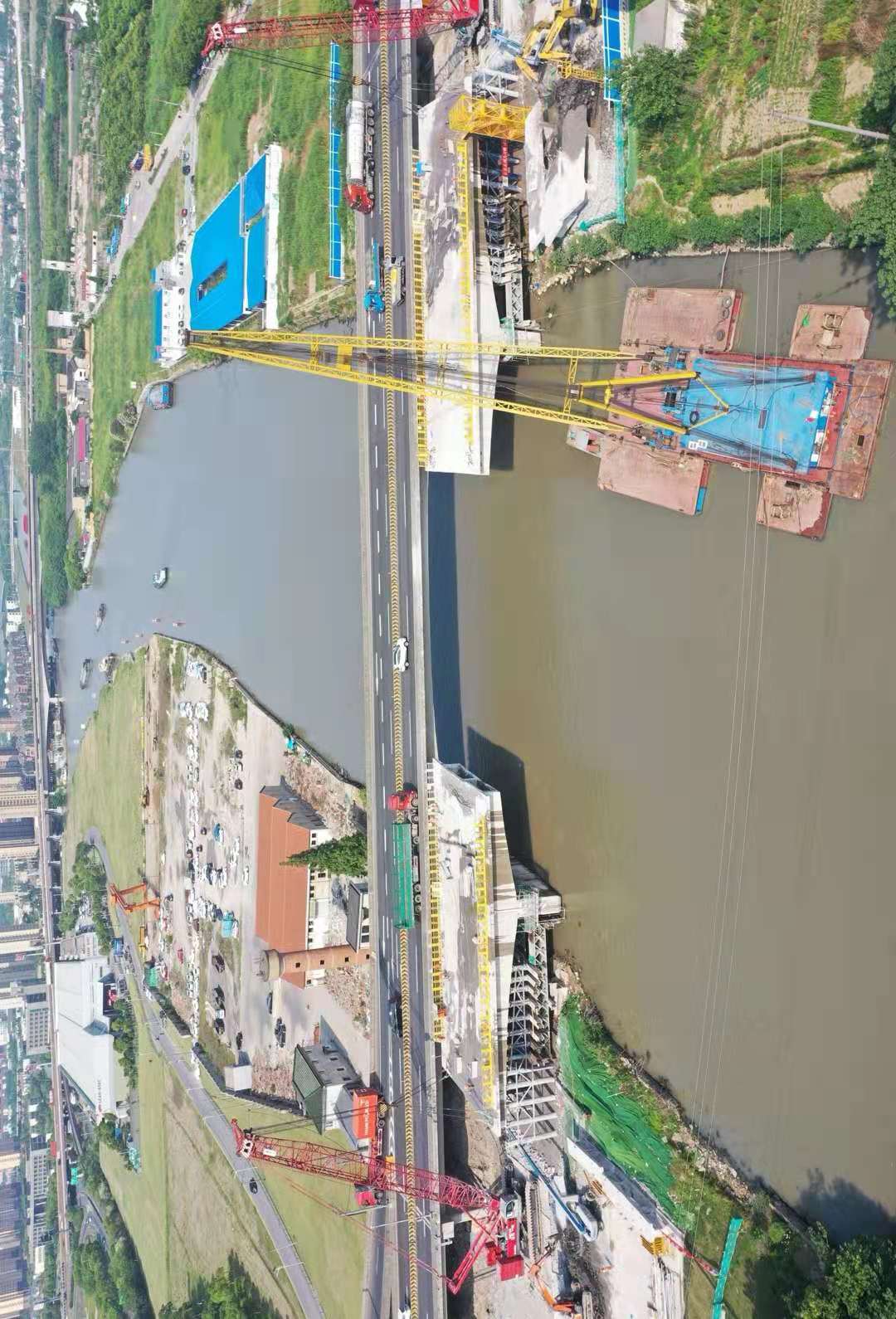 此次通车的新建主桥全长1573米,是目前上海地区跨径最大、桥幅最宽的三跨连续钢箱梁结构。施工过程中不仅需要纵向分段,还需要进行上下分段,对安装精度要求更高。新桥主跨138米,采用钢-混凝土组合连续箱梁连接而成,总重约8200吨,分18节运输,最重达289吨。从运输船卸船后运至指定安装位置,安装偏差不超过2毫米。为此,施工过程中通过采用三维模拟,确保分段交工质量,在节段加工完成后进行实体预拼装,现场采用水中吊装平台加起重机进行安装以确保安装准确。