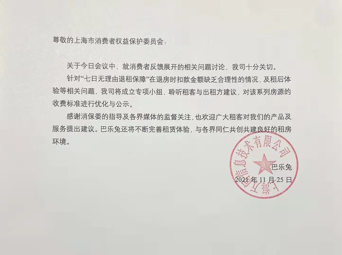 25日下午,巴乐兔就今日消费委约谈中消费者反馈的相关问题作出回应。针对“七日无理由退租保障”在退房时扣款金额缺乏合理性的情况,及租后体验等相关问题,将立即成立专项小组,聆听租客与出租方建议,对该系列房源的收费标准进行优化与公示。