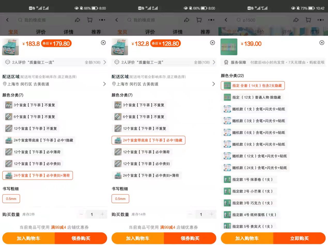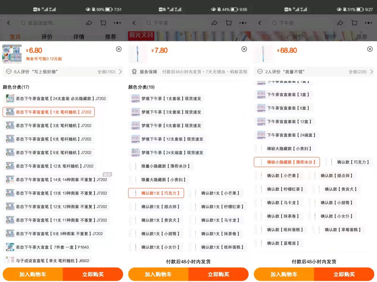 以某电商平台售价为例,晨光“梦境下午茶”系列中性笔盲盒一共14种普通人物款加2种隐藏人物款,如果随机发货,一支为6.8元,指定普通人物款,价格升至7.8元,若指定隐藏人物款价格竟高涨至68.8元。按照传统卖笔模式,脱掉盲盒外壳当做普通中性笔售卖,零售均价仅在3到4元左右,而加上盲盒包装,隐藏款溢价竟可高达14倍。
