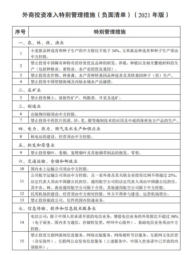 国家发展改革委、商务部于今日发布《外商投资准入特别管理措施(负面清单)(2021年版)》和《自由贸易试验区外商投资准入特别管理措施(负面清单)(2021年版)》,自2022年1月1日起施行。据了解,本次修订中,在汽车制造领域,取消乘用车制造外资股比限制以及同一家外商可在国内建立两家及两家以下生产同类整车产品的合资企业的限制。