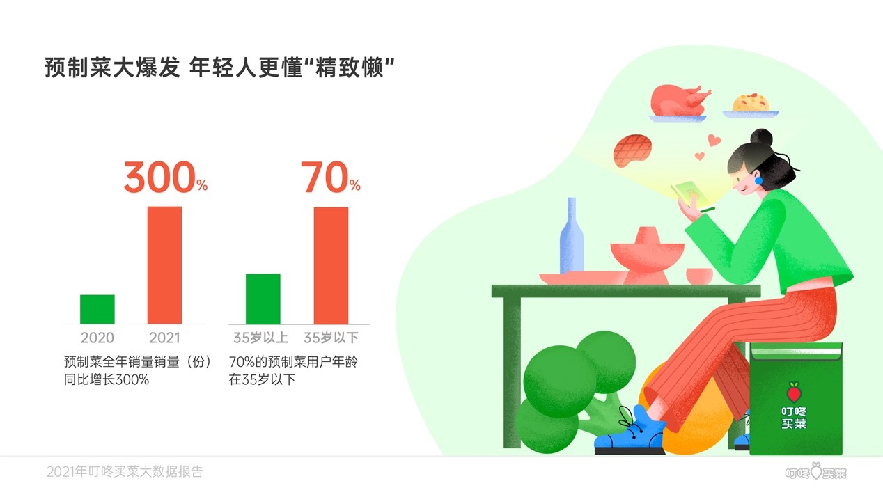 市场环境的变数和常态化的防疫生活,让都市人的生活习惯和消费行为默默发生了新的变化。1月17日,生鲜供应链企业叮咚买菜发布了《2021年度消费趋势报告》(下称“报告”)。数据显示,2021年在购买预制菜的用户中,超过70%的用户年龄在35以下。可高效烹饪菜肴、口感还原度高,让年轻人爱上“预制菜”。