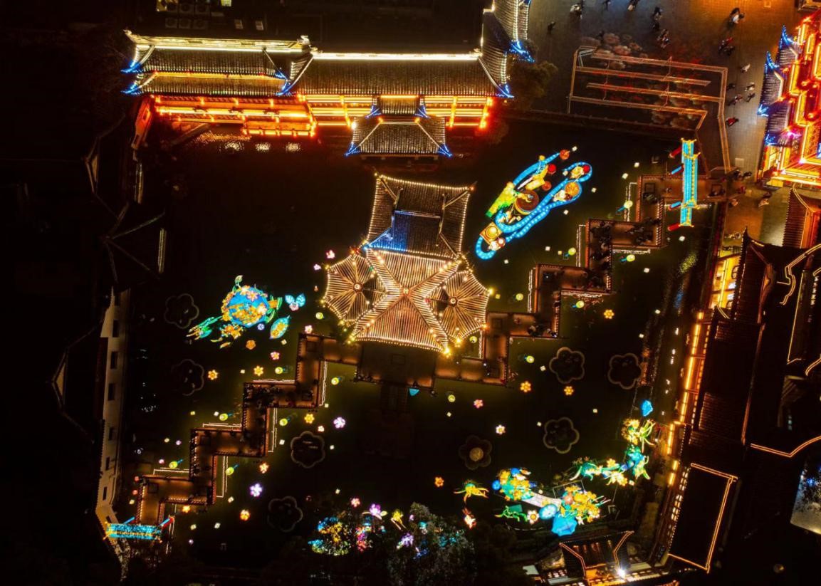 劳动报记者了解到,2月11日至2月15日,豫园千灯点亮,恭迎“天官赐福”。每日两场,“天官”携“南极仙翁”、“五谷牛郎”、“天孙织女”、“送子张仙”和“增福财神”,将闪现于豫园各处福地与大家共闹元宵。看豫园商城的非遗灯彩齐齐点亮,以“张灯”的形式,为游客提供赏灯纳福的美好氛围。中心广场高约9米的“虎跃东方”生肖灯组尤为壮丽。华宝楼墙面,一幅“千里江山图”徐徐展开,写就“百年恰是风华正茂”图卷,呼应巍峨的虎灯。