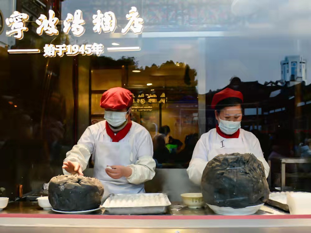 “从早晨6点多到岗,一直持续到晚上9点半,就在这个正对九曲桥的沿街空间里手忙不停地包汤团。”艾水花告诉劳动报记者,自己在宁波汤团店包汤团已有十多年的时间,现在已然是熟练工。“前面采用透明玻璃,正对着九曲桥的景观位,往来市民能看到我在手工现包,元宵前更是年味儿十足。”