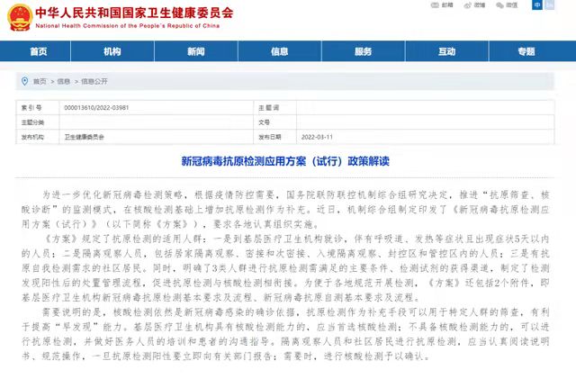 据悉,3月11日,国家卫生健康委员会发布《新冠病毒抗原检测应用方案(试行)》,明确在核酸检测基础上,增加抗原检测作为补充。其中提到社区居民有自我检测需求的,可通过零售药店、网络销售平台等渠道,自行购买抗原检测试剂进行自测。