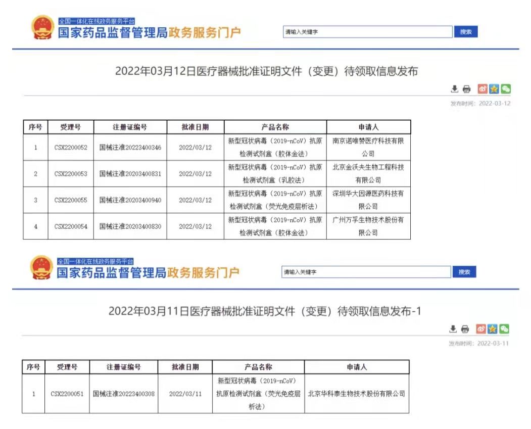 3月12日,国家药监局发布通告,批准南京诺唯赞等5家公司的新冠抗原产品应用申请变更。自此,国内新冠抗原检测产品正式上市。