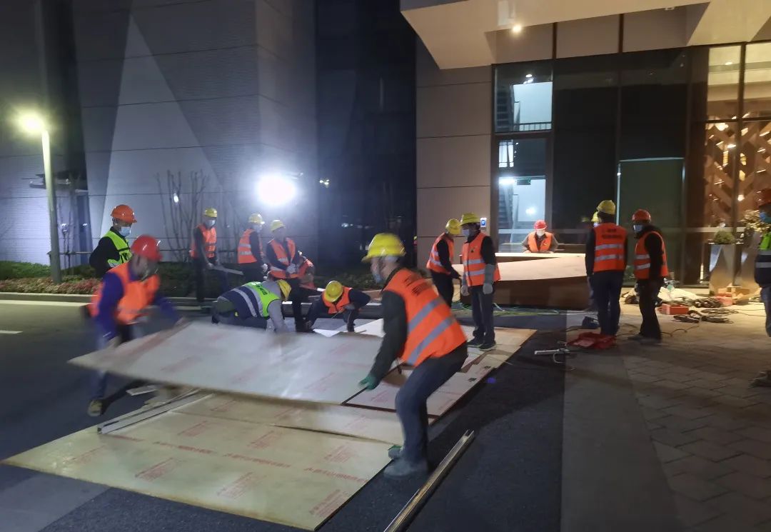 晚间18点,施工材料全部到场,各工种工人全部分配就位,集中隔离点改造有序开展。为减少改造过程中的粉尘污染,所有材料加工切割均在室外进行,室内一次完成安装,大幅缩短现场保洁时间。因现场电梯已超负荷运行,为缩短等候电梯时间,所有大型材料全部通过消防通道进行人力运输。