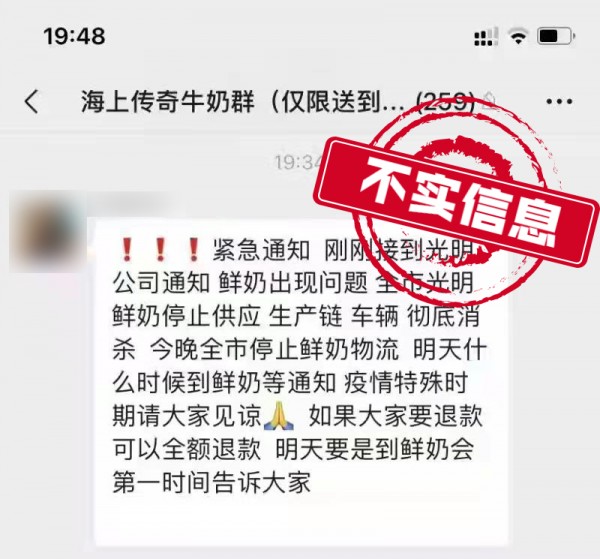 3月29日晚,部分市民在网上看到一张微信截图,在“海上传奇牛奶群”中,“全市光明牛奶停止供应,生产链、车辆、彻底消杀”的消息赫然在目。记者向光明乳业求证获悉,此为假消息,不存在全市暂停产品配送的情况。