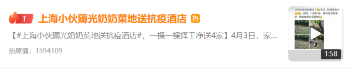 4月4日,上海一小伙薅光郊区奶奶家菜地,送菜给四家抗疫酒店的消息登上微博热搜榜第一名,阅读量超过3.8亿。当事人小付回应说,都是奶奶的“功劳”,相比每天在一线辛苦的保供人员和爱心酒店,自己只是尽了一点绵薄之力。